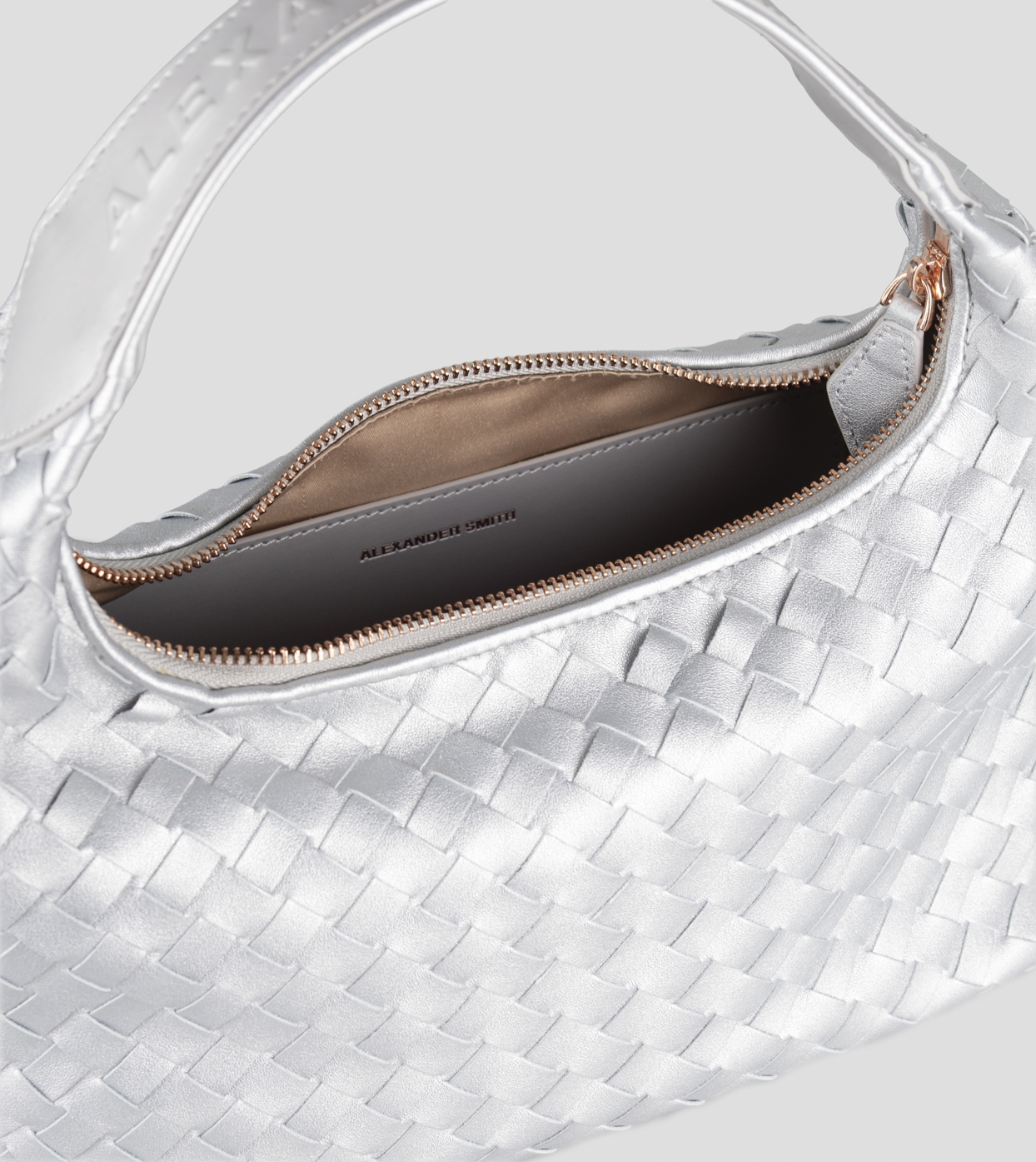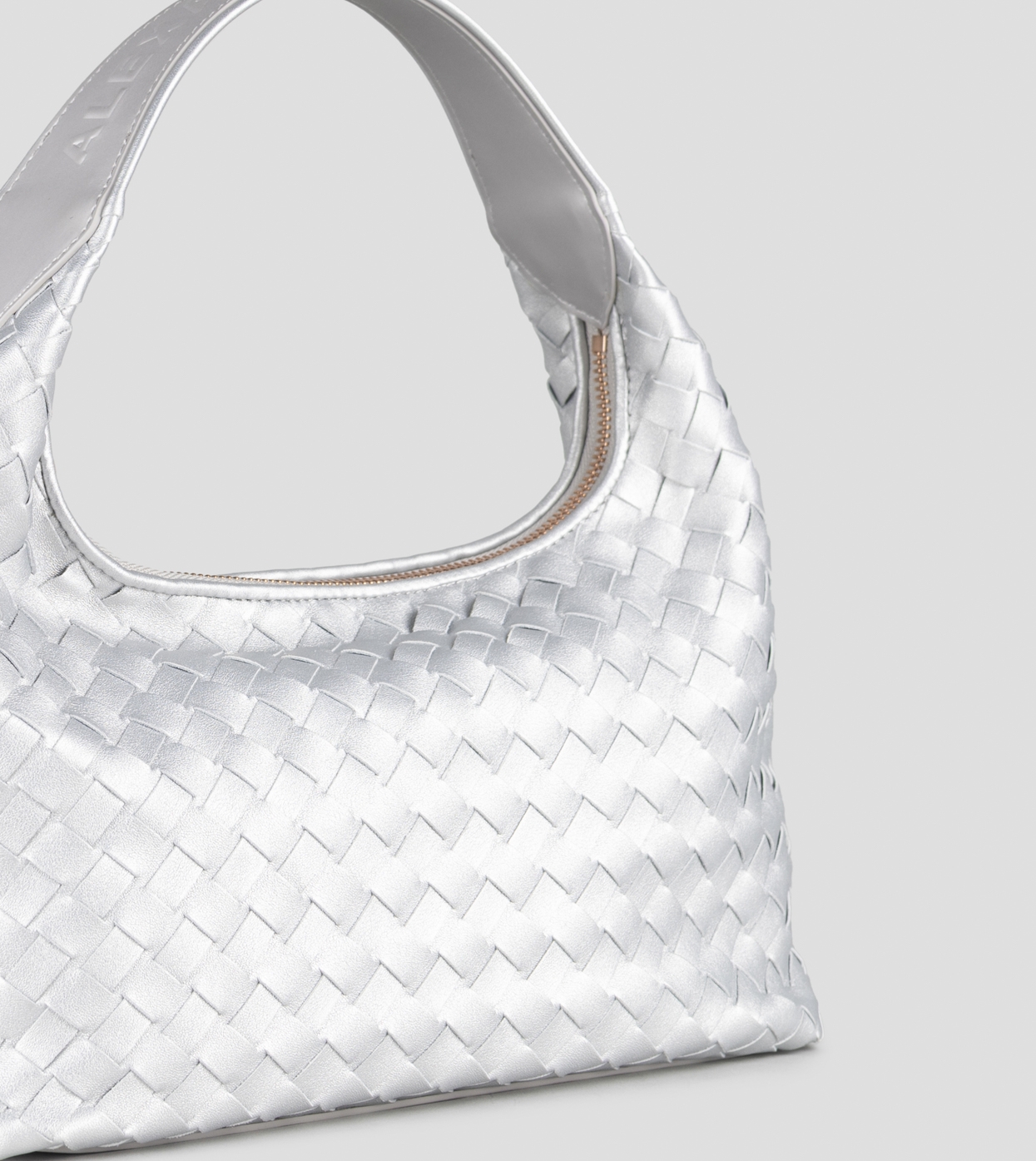 Soft lines, a confident soul.The new hobo bag blends comfort and sophisticated refinement in a timeless silhouette. CHLOE is the perfect bag to accompany you with elegance from day to night, thanks to its spacious interior and fluid yet structured design, presented in this version in silver laminated woven leather.Material: Woven leatherZip closureEmbossed logo on the handleInternal pocketDimensions:Length: 30 cmHeight: 32 cmDepth: 15 cm