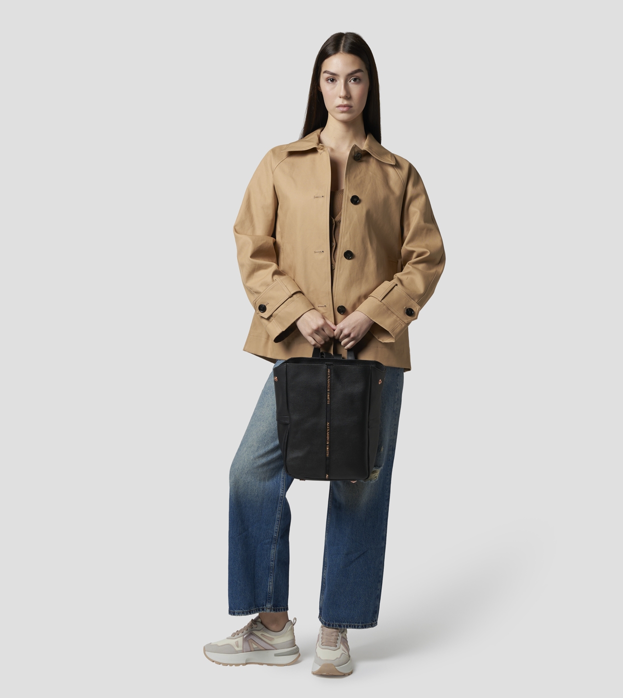 Clean lines, a soft structured volume, and refined details make it the perfect companion for any day—from work to leisure. The vertical signature tape adds character and identity, while the organized interior ensures maximum practicality.