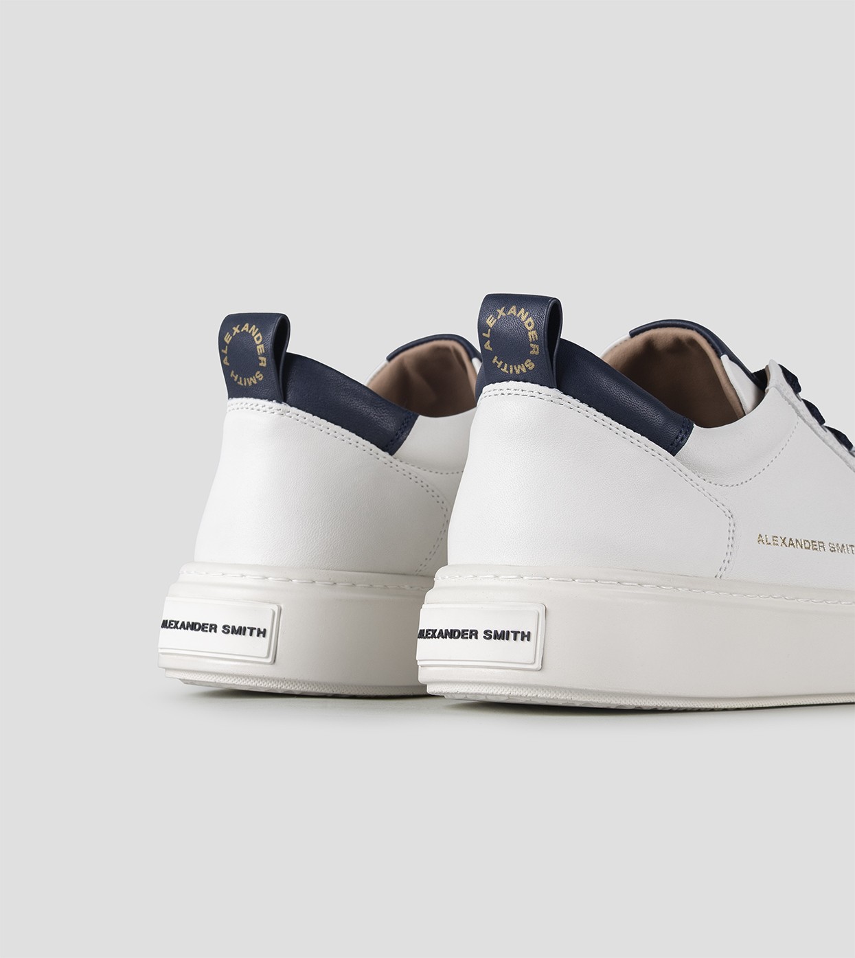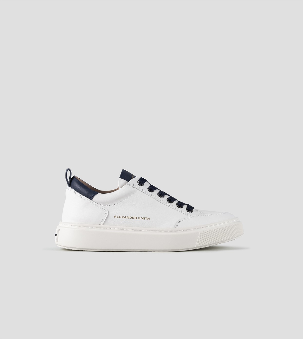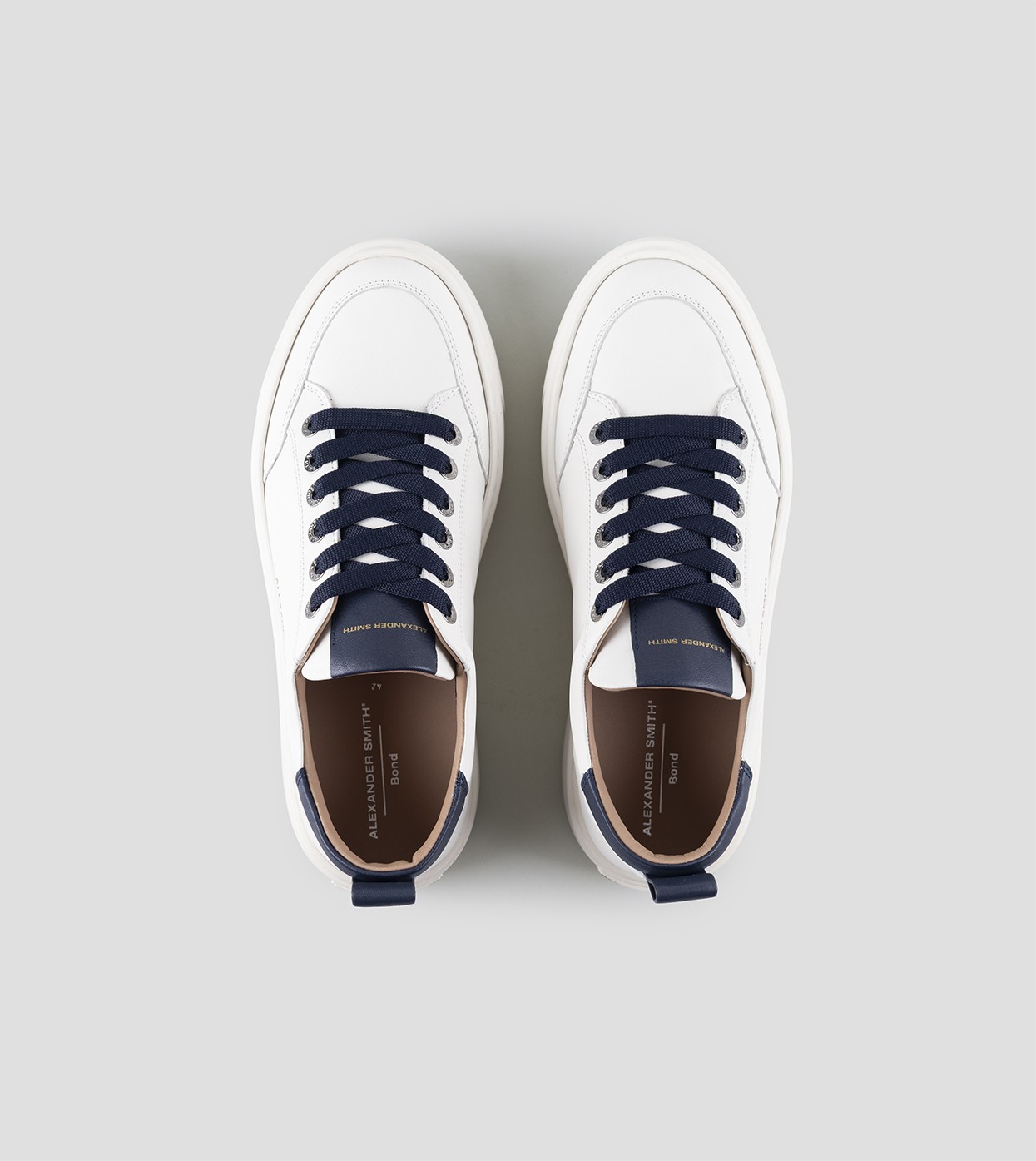 Bond Street è una via del centro di Londra, considerata una delle zone più lussuose della città, e una delle principali vie dello shopping della capitale Inglese. È anche il richiamo per la nuova Bond di Alexander Smith, che nasce per reinterpretare un modello istituzionale donandogli più carattere: la selezione di materiali personalizzati come gli occhielli logati e la suola importante sono gli elementi chiave di questo modello, in questa variante con tomaia in pelle di capra bianca e dettagli in pelle blu.
