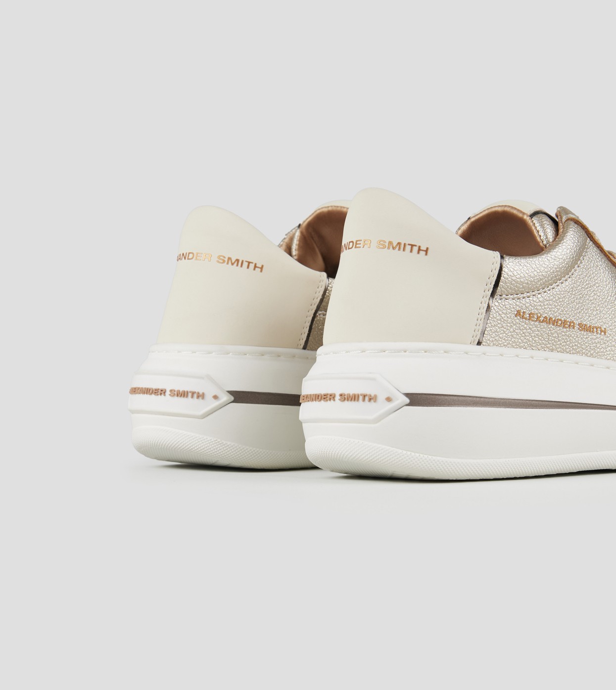 Il modello prende il nome da Lancaster Gate, zona del centro di Londra adiacente ai Kensington Gardens: un’area residenziale in cui lo stile classico e barocco delle abitazioni si fonde con i resti di una chiesa Gotica del 1800. Con lo stesso perfetto mix di stili, la Lancaster di Alexander Smith è un match tra i dettagli preziosi e ricercati della tomaia e degli occhielli, con l’audacia e l’importanza della suola, per uno stile che combina eleganza e unicità, in perfetta sintonia con l’anima del brand, in questa variante in pelle bottalata laminata oro e tallone bianco.