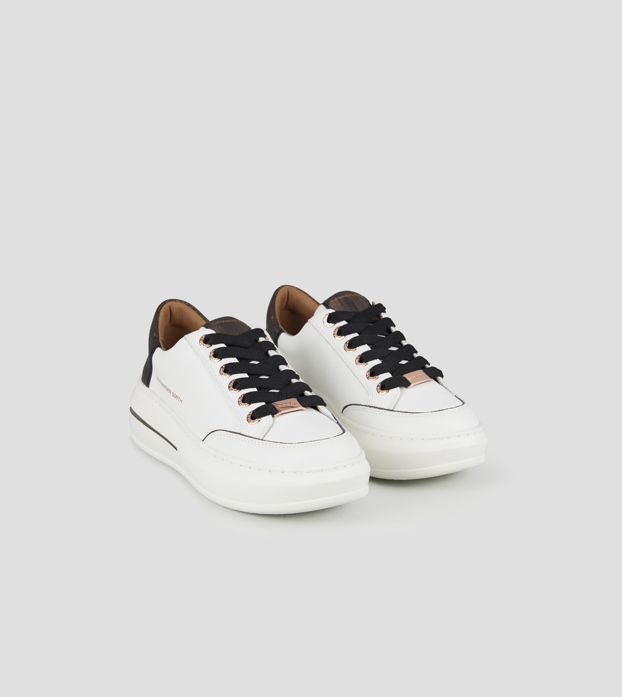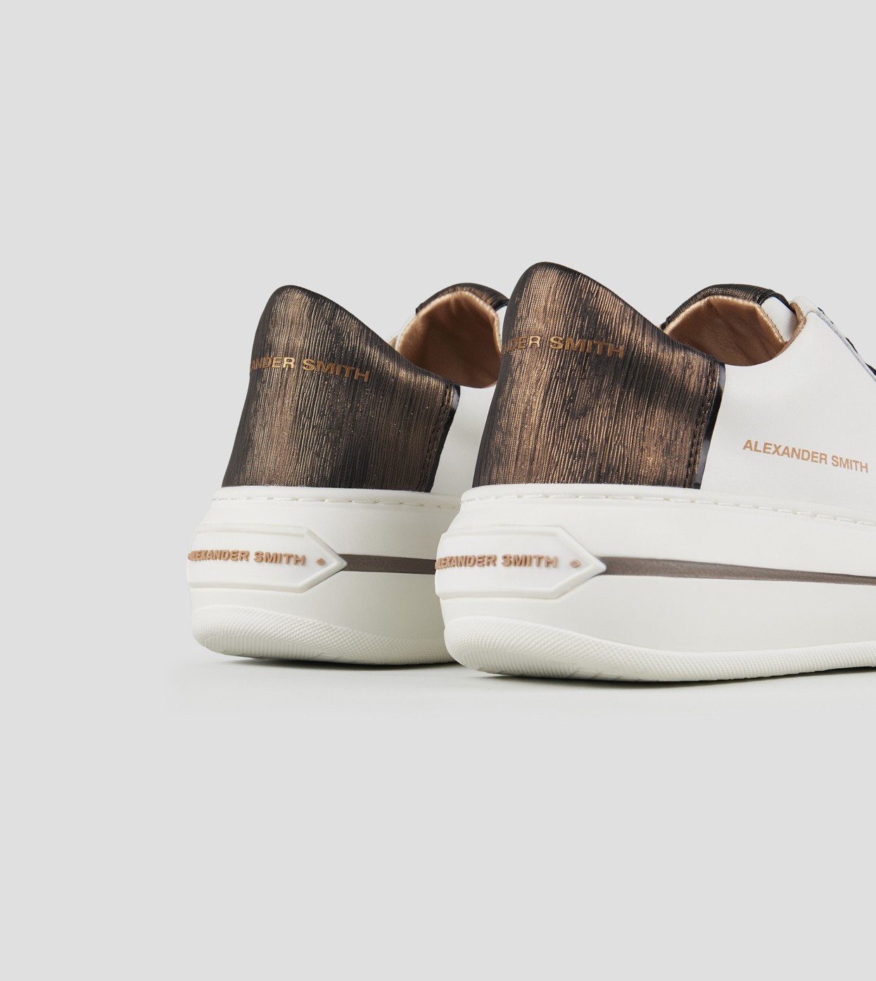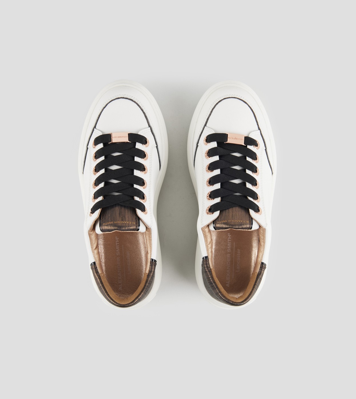 Il modello prende il nome da Lancaster Gate, zona del centro di Londra adiacente ai Kensington Gardens: un’area residenziale in cui lo stile classico e barocco delle abitazioni si fonde con i resti di una chiesa Gotica del 1800. Con lo stesso perfetto mix di stili, la Lancaster di Alexander Smith è un match tra i dettagli preziosi e ricercati della tomaia e degli occhielli, con l’audacia e l’importanza della suola, per uno stile che combina eleganza e unicità, in perfetta sintonia con l’anima del brand, in questa variante in pelle bianca e tallone in laminato rigato rame.
