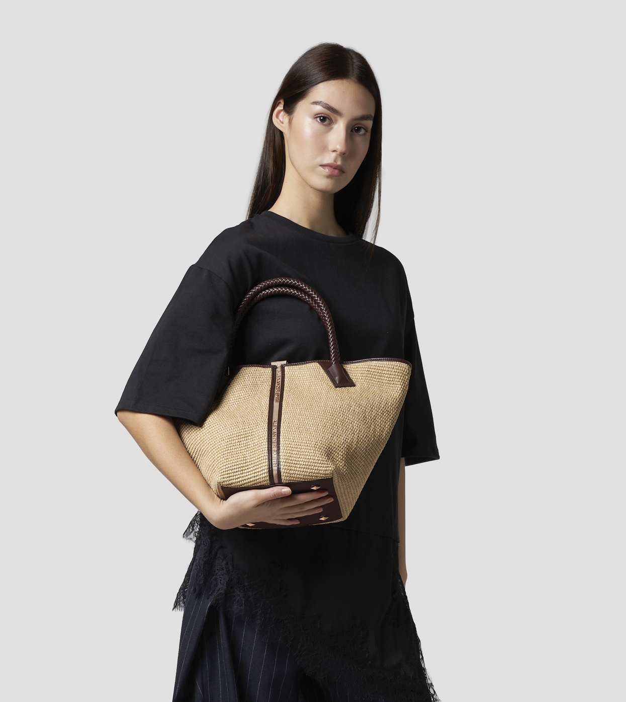 Lauren Medium borsa a mano con tracolla in rafia beige e manico intrecciato marrone