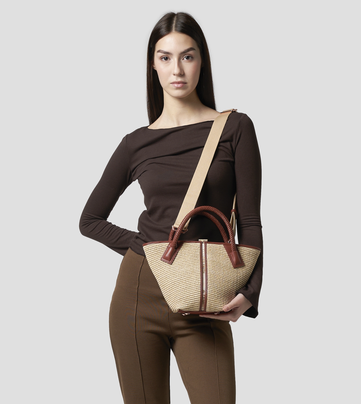 Lauren Small borsa a mano con tracolla in rafia beige e manico intrecciato marrone