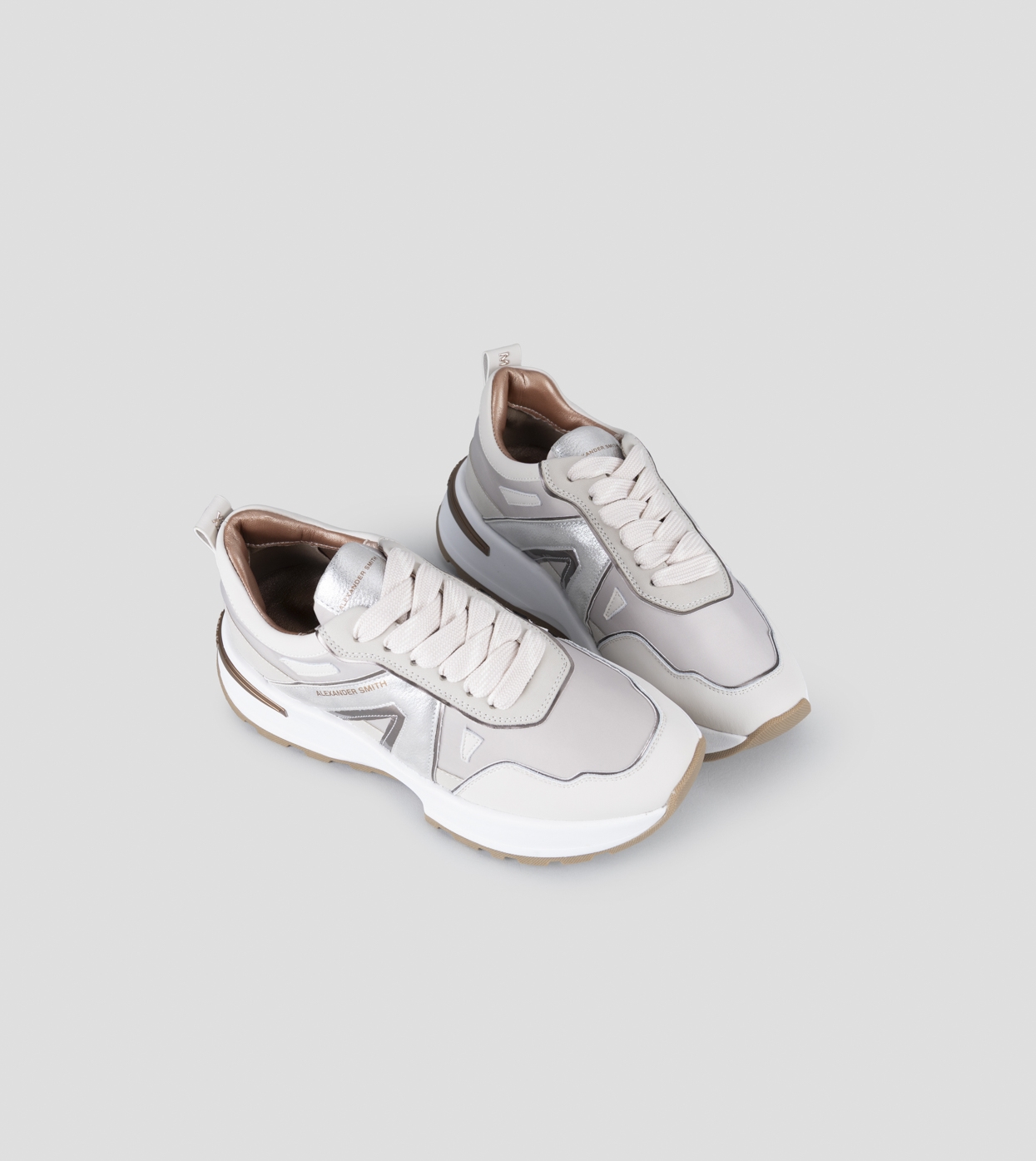 Il nuovo modello firmato Alexander Smith, che prende ispirazione da una delle città più iconiche del Regno Unito, è la nuova proposta running del brand: linea affusolata, suola importante e dettagli ricercati danno vita ad una sneakers versatile e distintiva, in questa variante in nylon avorio e laminato polveroso in tinta. In omaggio laccio flat rosa pastello con tratteggi bianchi.