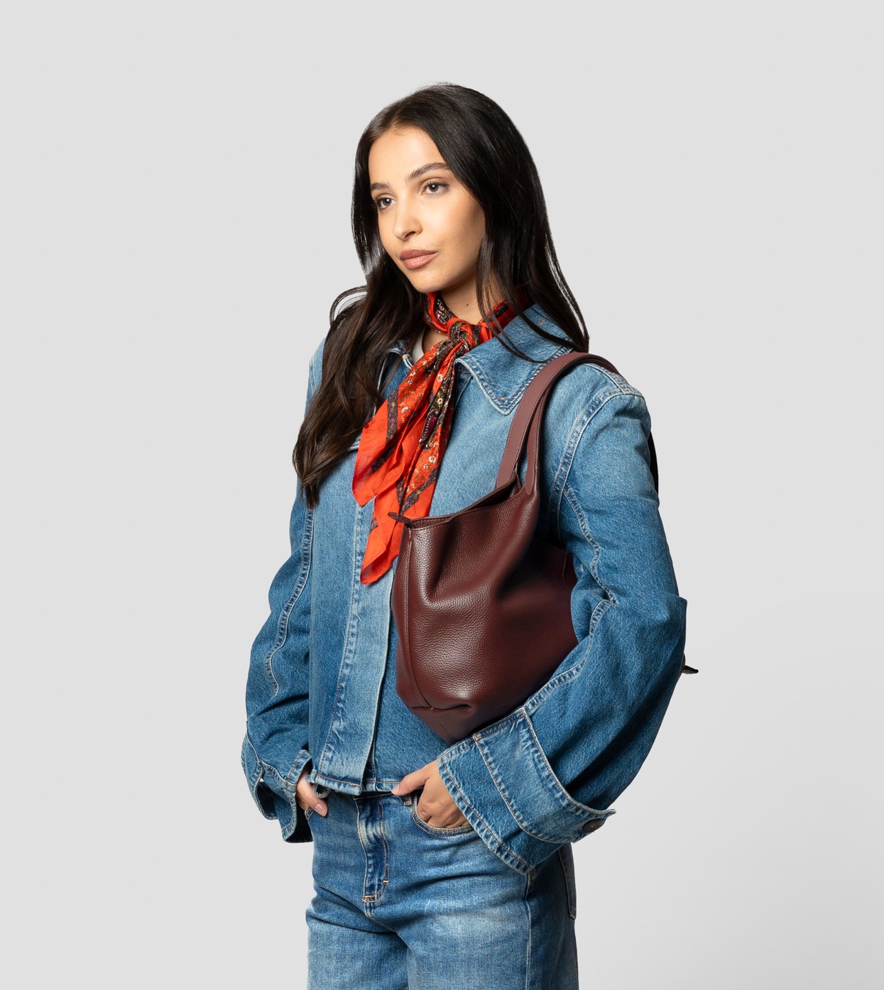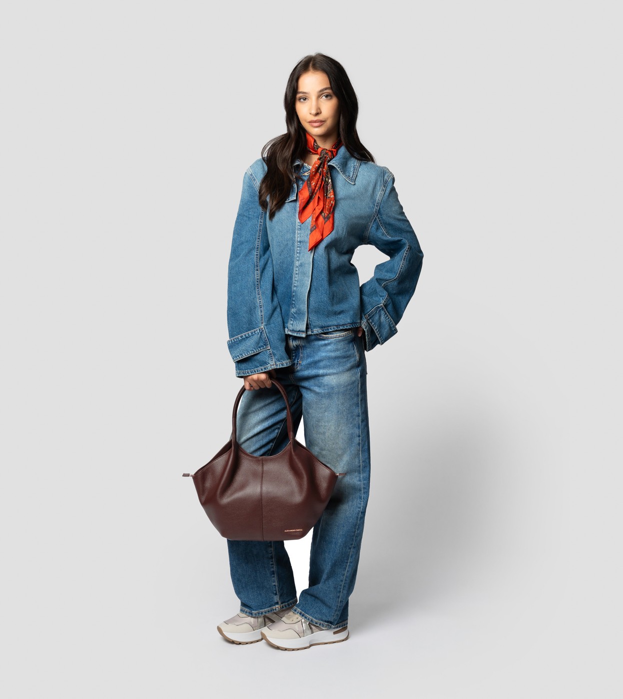 RACHEL è la shopper che interpreta l’equilibrio tra comfort e stile con forme fluide e proporzioni generose. Il design essenziale valorizza la sua silhouette ampia e accogliente, ideale per accompagnare ogni momento della giornata con eleganza rilassata.