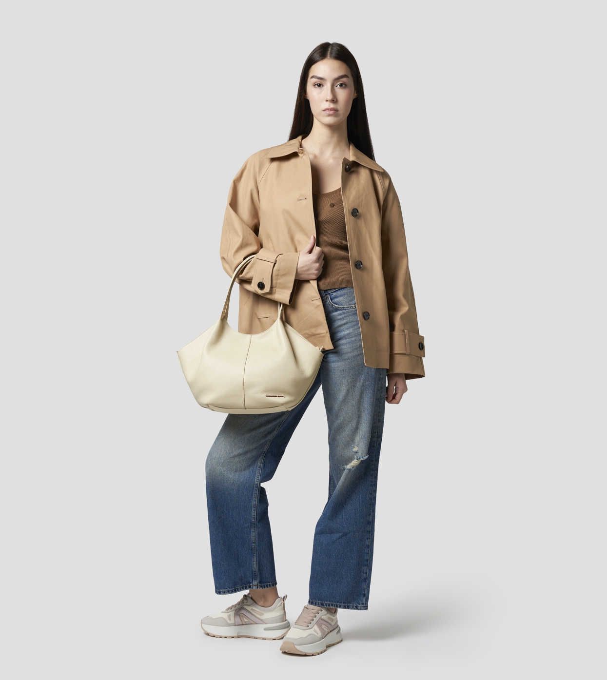 RACHEL è la shopper che interpreta l’equilibrio tra comfort e stile con forme fluide e proporzioni generose. Il design essenziale valorizza la sua silhouette ampia e accogliente, ideale per accompagnare ogni momento della giornata con eleganza rilassata.