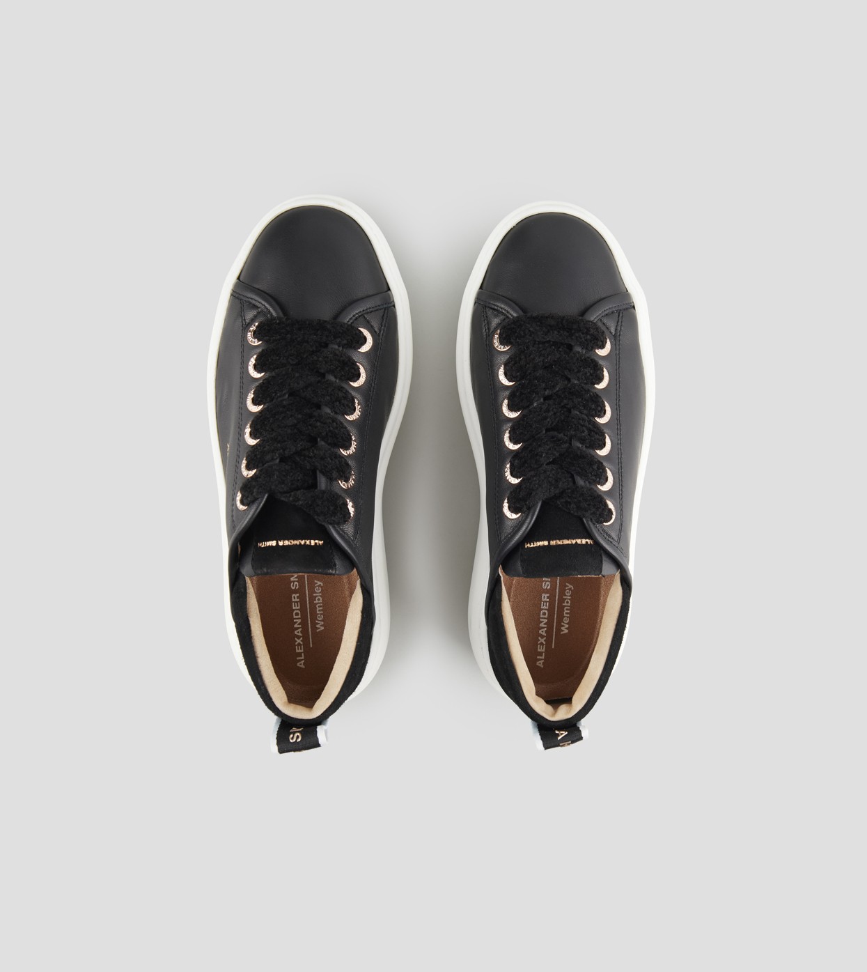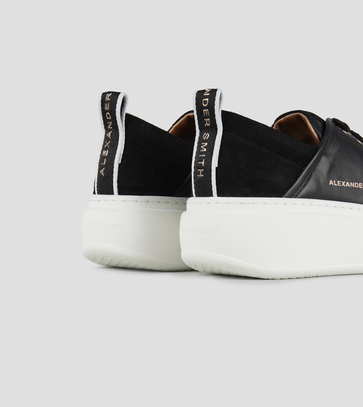 L'iconica Wembley evolve in questa variante con suola più alta, mantenendo lo stile e il design del modello originale, con un tocco di audacia in più, in questa variante in morbida pelle nera e suede.