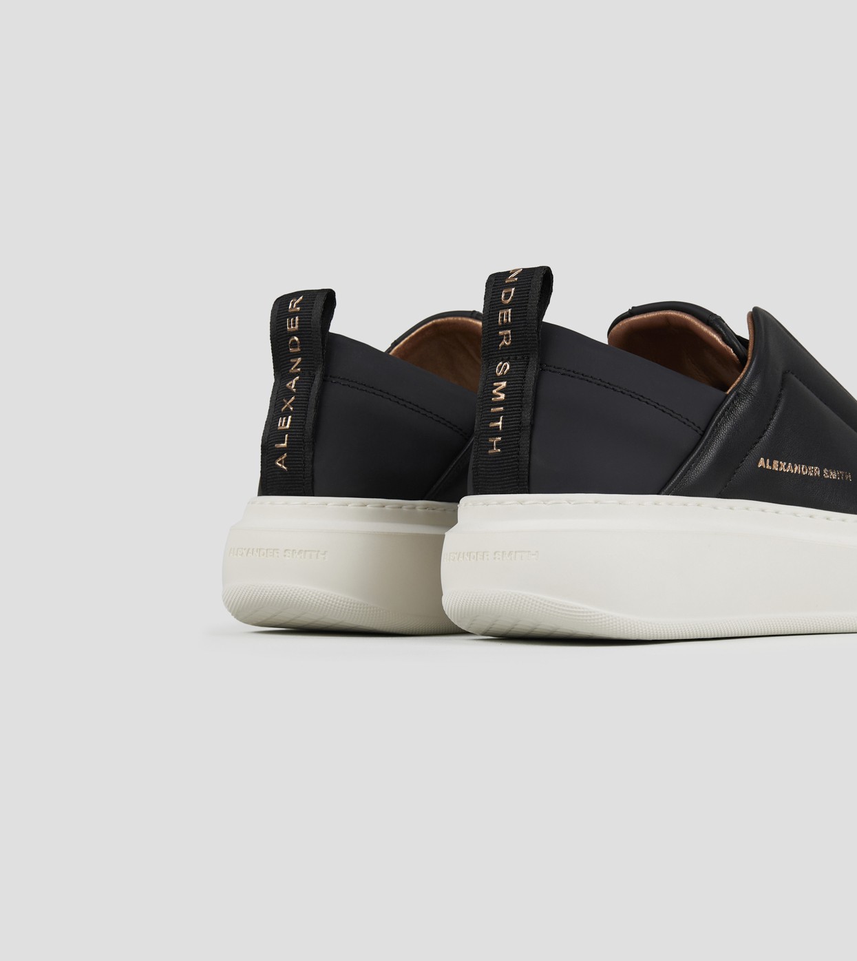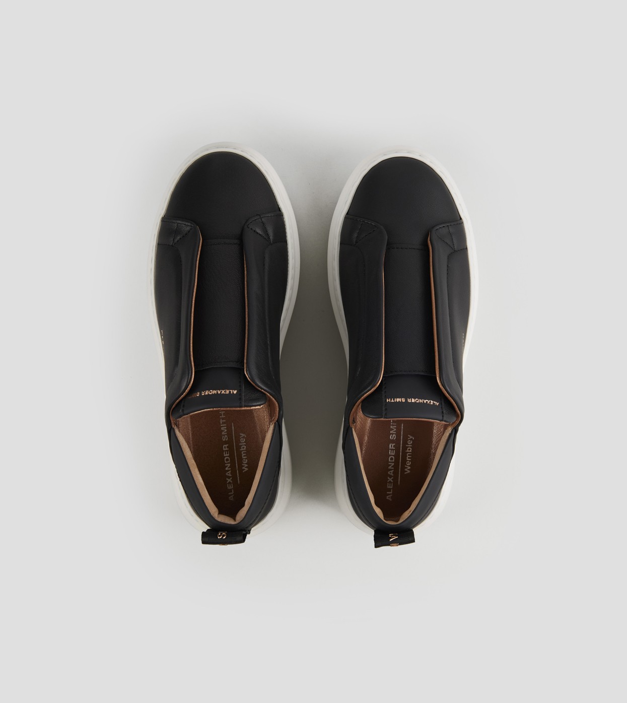 L'iconica Wembley evolve in questa variante slip-on, che mantiene lo stile e il design del modello originale, con la freschezza di una nuova interpretazione senza lacci, in questa versione in pelle nera.