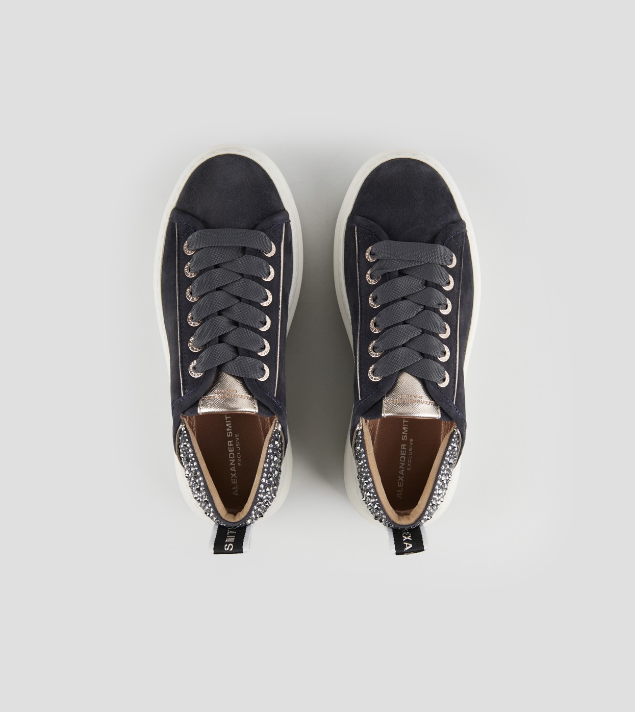 Il riferimento al famoso stadio inglese è chiaro: sportività ed eleganza si fondono per dare vita a questo modello. Le Wembley rappresentano l’equilibrio tra comodità, stile e sobrietà, ai quali si aggiunge modernità grazie ai dettagli unici che fanno la differenza, in questa versione in suede grigio scuro e tallone con strass.