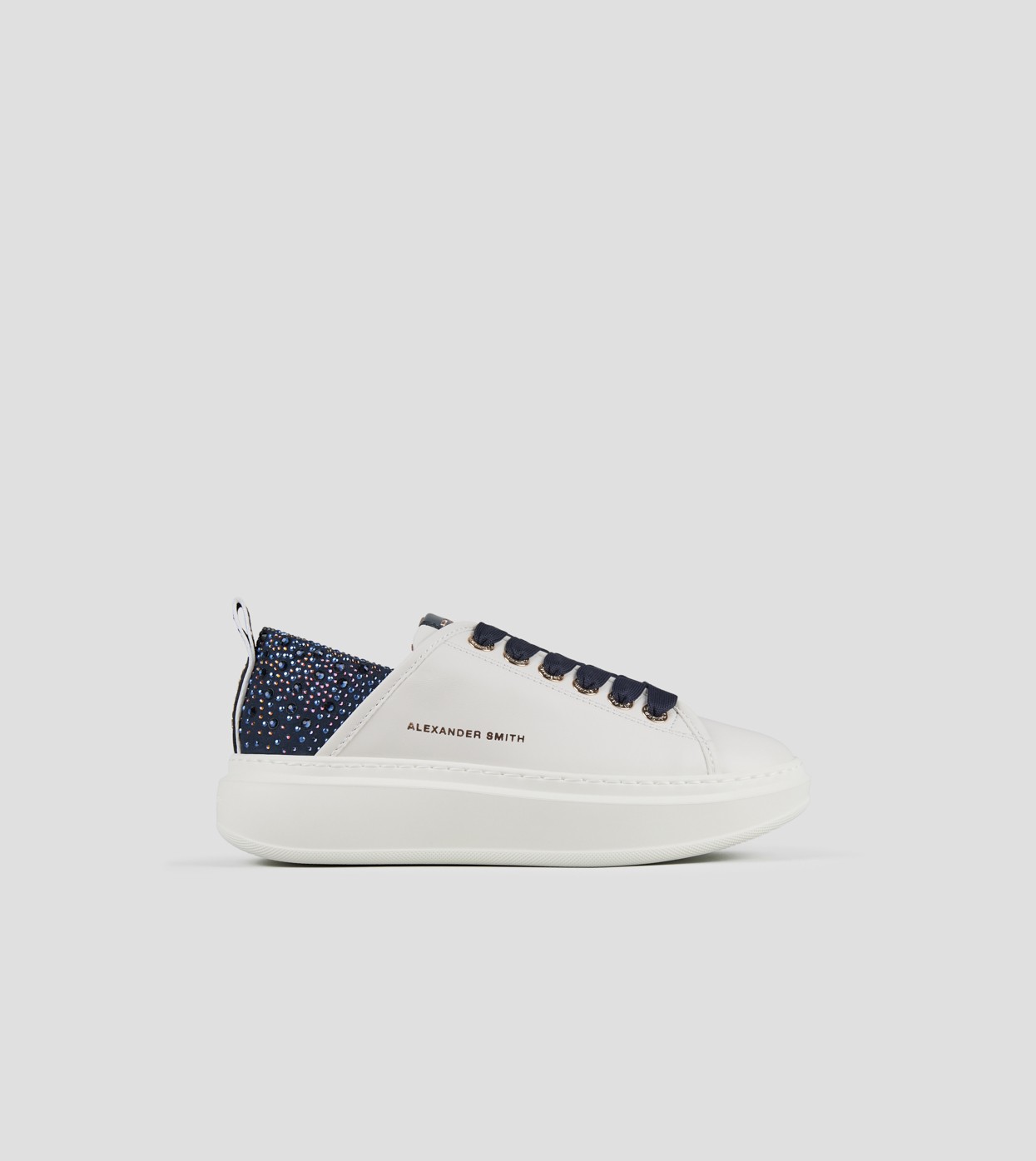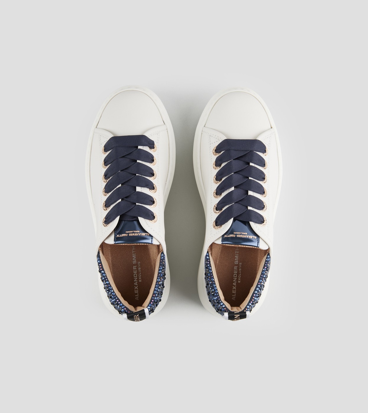 Il riferimento al famoso stadio inglese è chiaro: sportività ed eleganza si fondono per dare vita a questo modello. Le Wembley rappresentano l’equilibrio tra comodità, stile e sobrietà, ai quali si aggiunge modernità grazie ai dettagli unici che fanno la differenza, in questa versione in pelle bianca e tallone blu con strass.