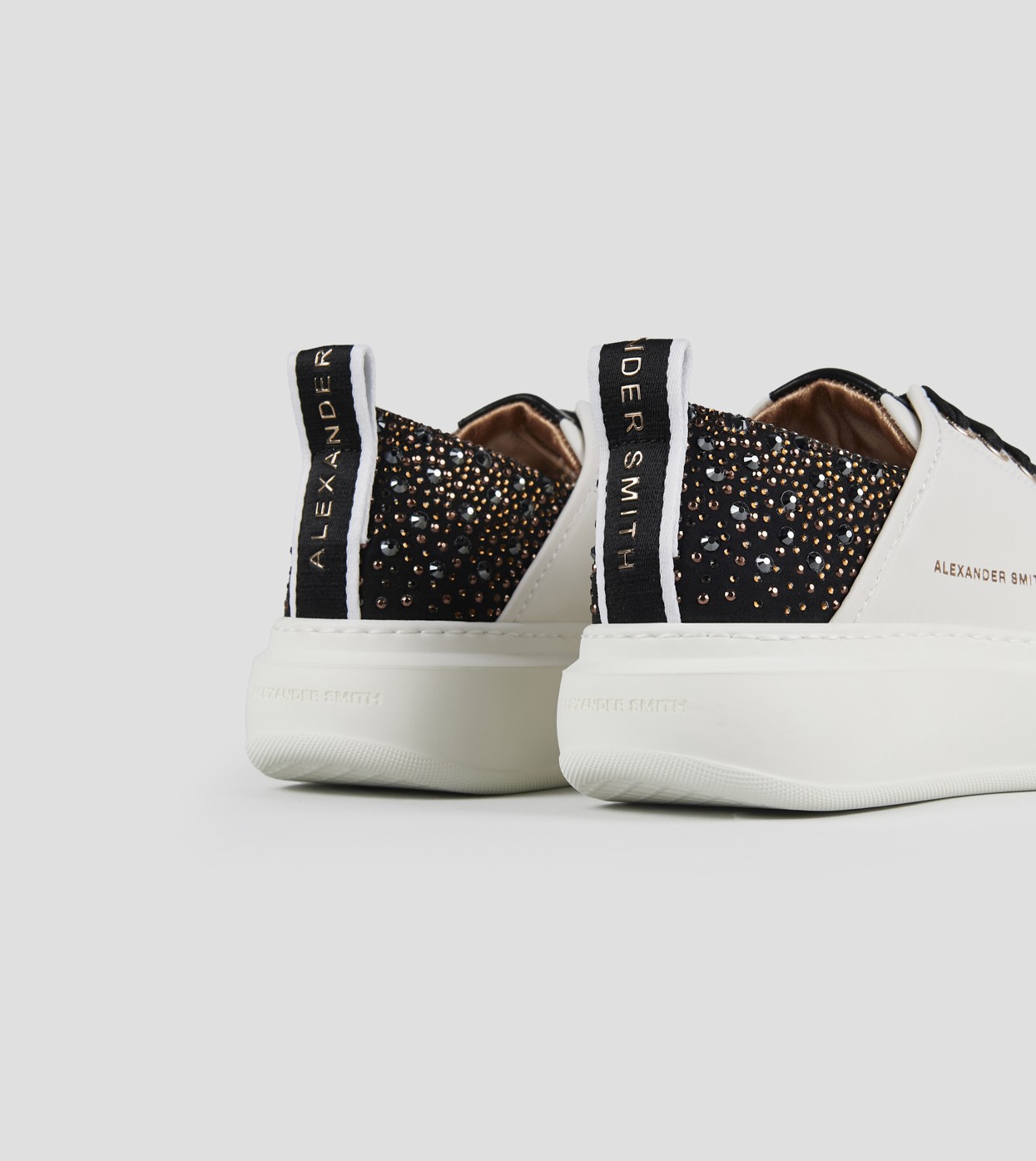 Il riferimento al famoso stadio inglese è chiaro: sportività ed eleganza si fondono per dare vita a questo modello. Le Wembley rappresentano l’equilibrio tra comodità, stile e sobrietà, ai quali si aggiunge modernità grazie ai dettagli unici che fanno la differenza, in questa versione in pelle bianca e tallone nero con strass.