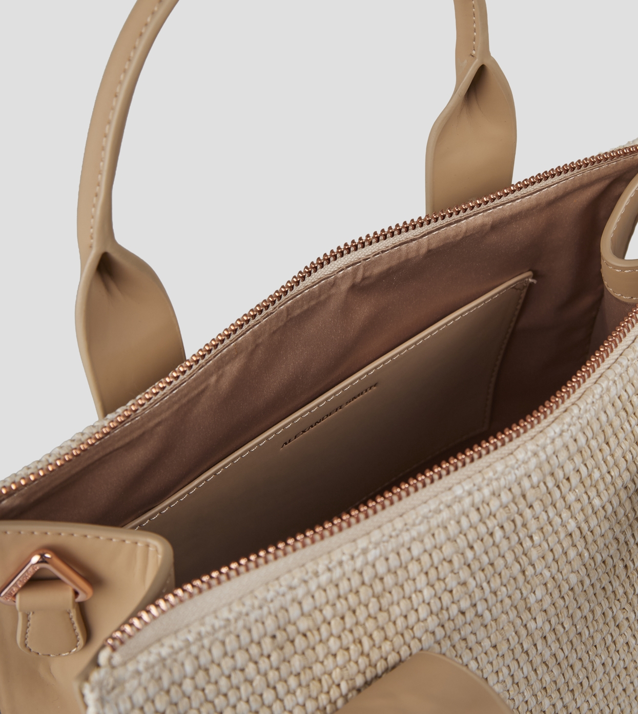Essential design and contemporary soul.JANE is a tote bag with a bold structure and urban character, designed to accompany you every day with style. Its clean lines and integrated handles define its identity, combining aesthetics and functionality in perfect balance.Material: RafiaEmbossed copper metal logoZip closureShoulder strap includedInternal pocketDimensions:Length 26 cmHeight 30 cmDepth 11 cm