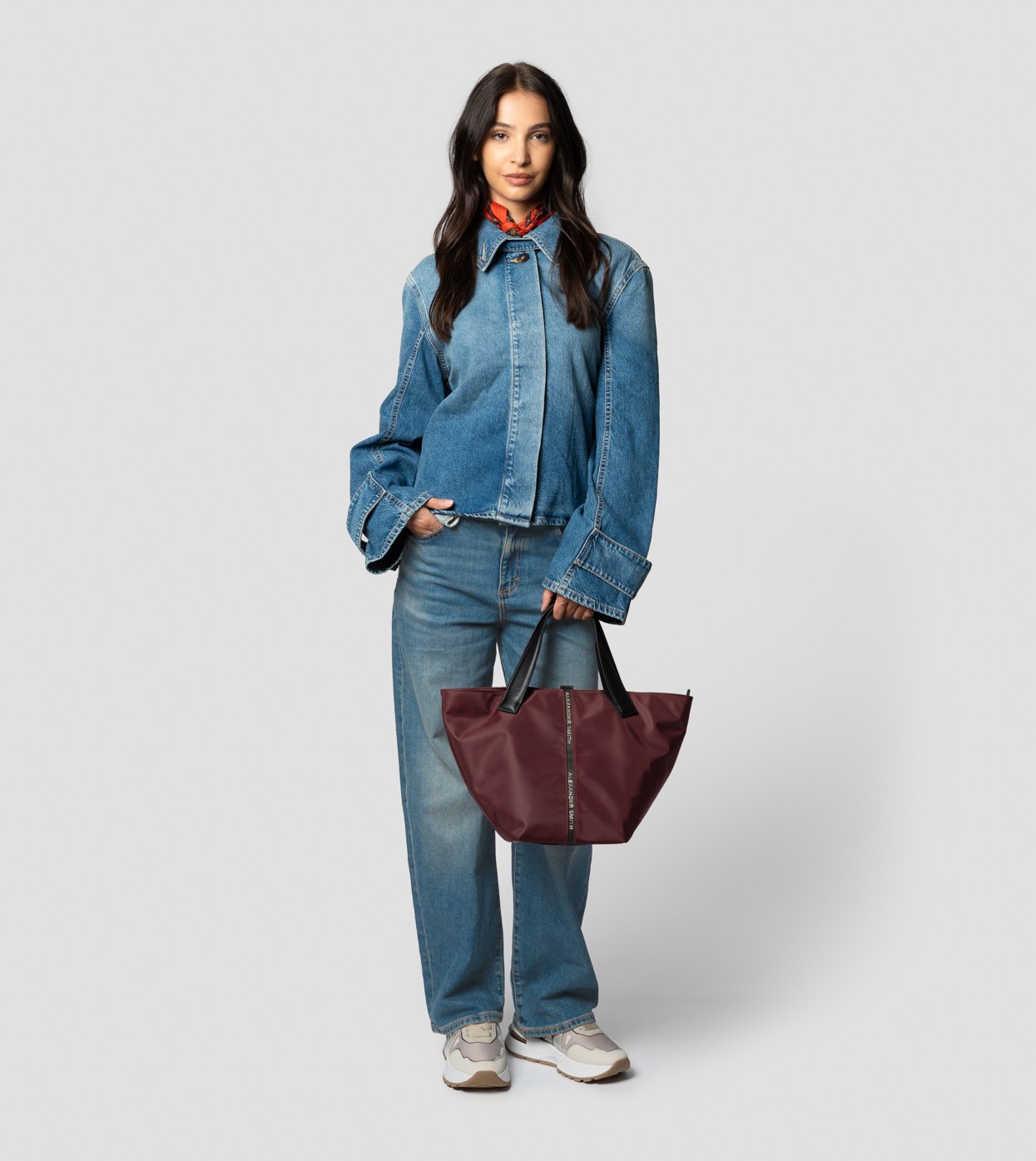 LAUREN is a shopper bag that combines functionality and style in a contemporary and bold design. The geometric lines and central logo detail define a strong yet versatile character, perfect for completing any look with a modern touch.