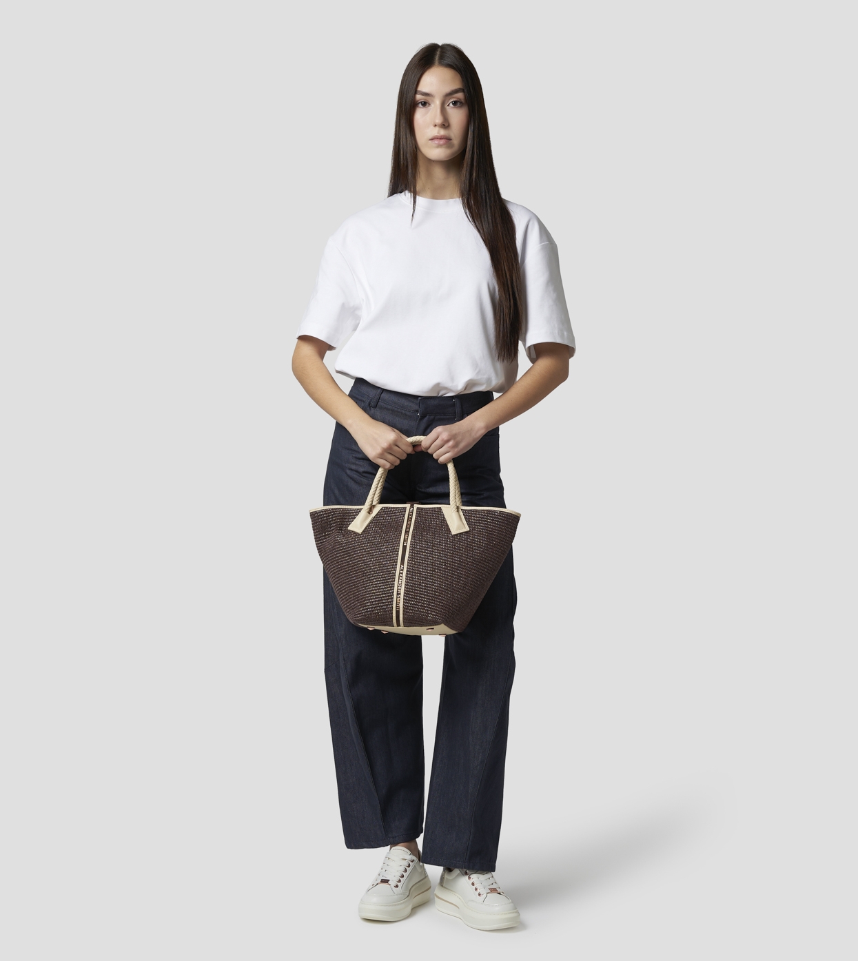 Lauren Medium handbag with shoulder strap in brown raffia and woven handle
