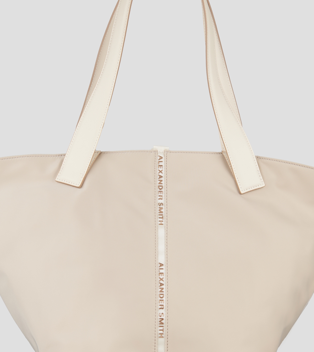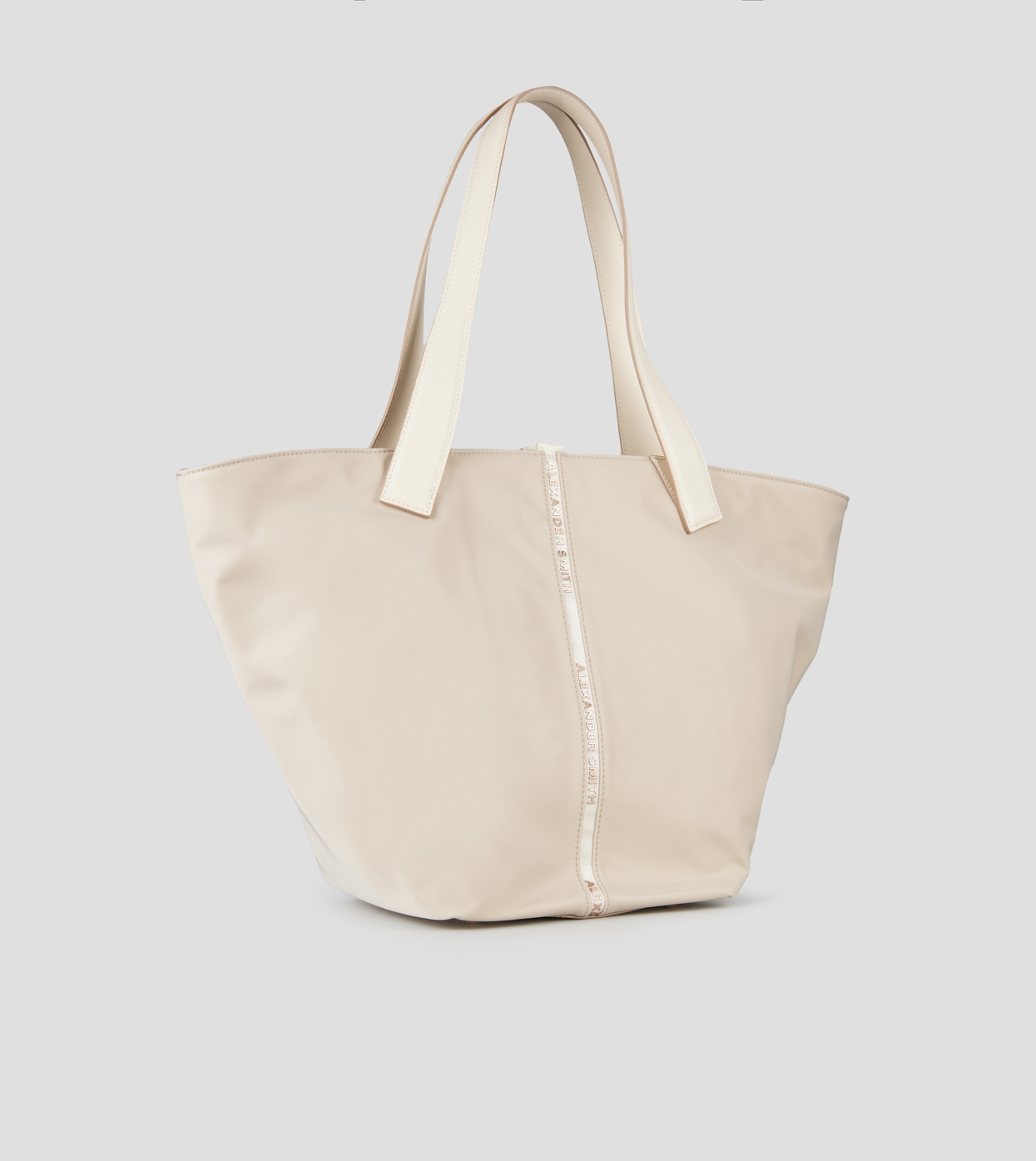 LAUREN is a shopper bag that combines functionality and style in a contemporary and bold design. The geometric lines and central logo detail define a strong yet versatile character, perfect for completing any look with a modern touch.