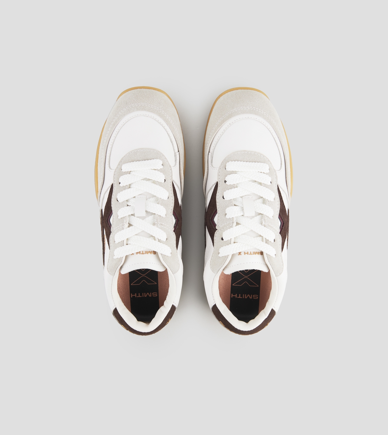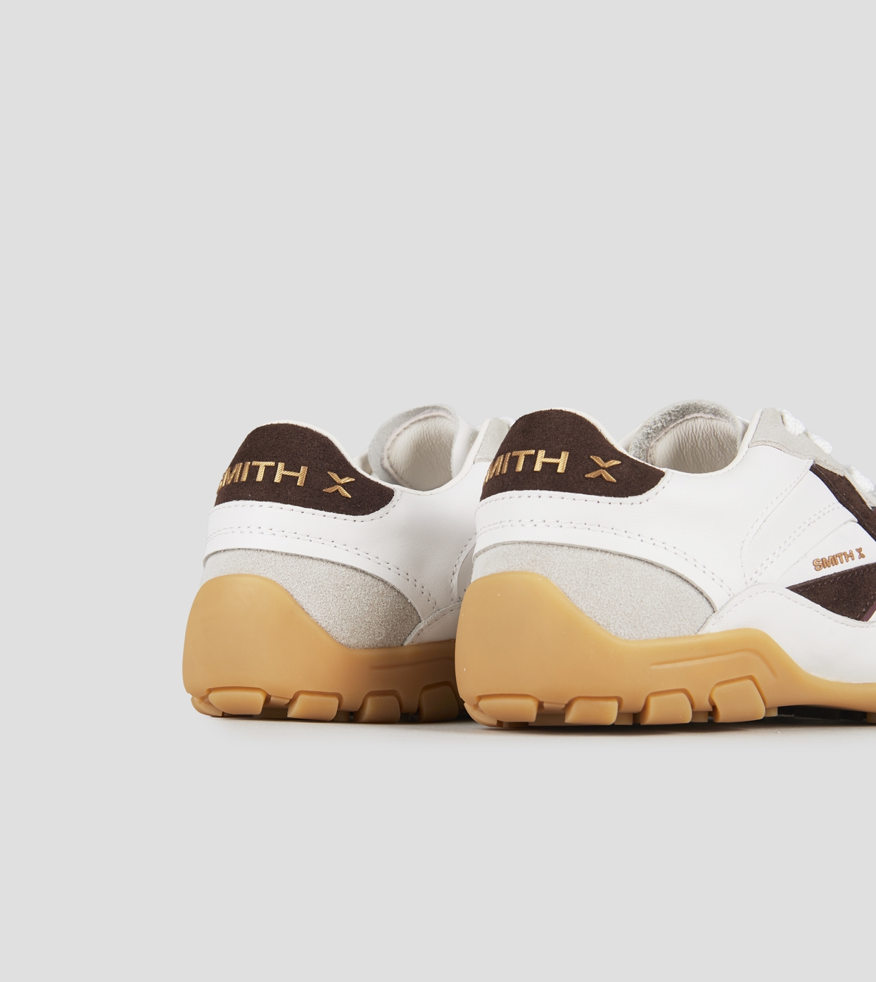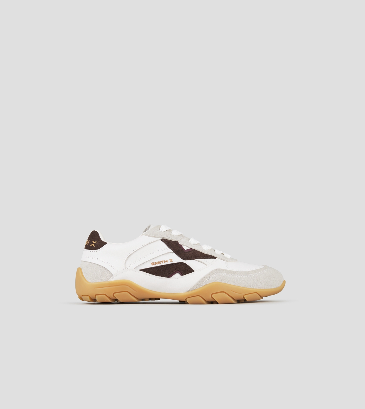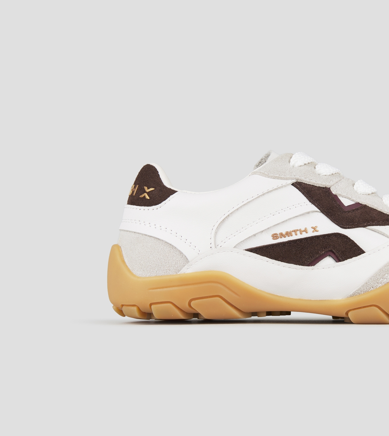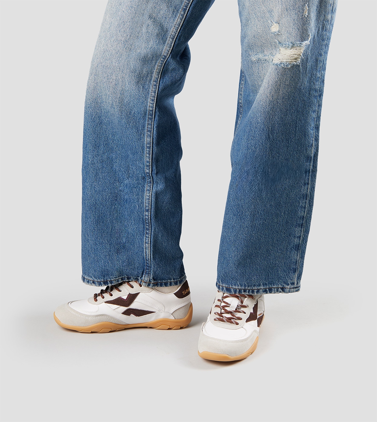 Mist Woman in white with grey suede details, and brown suede logo and back