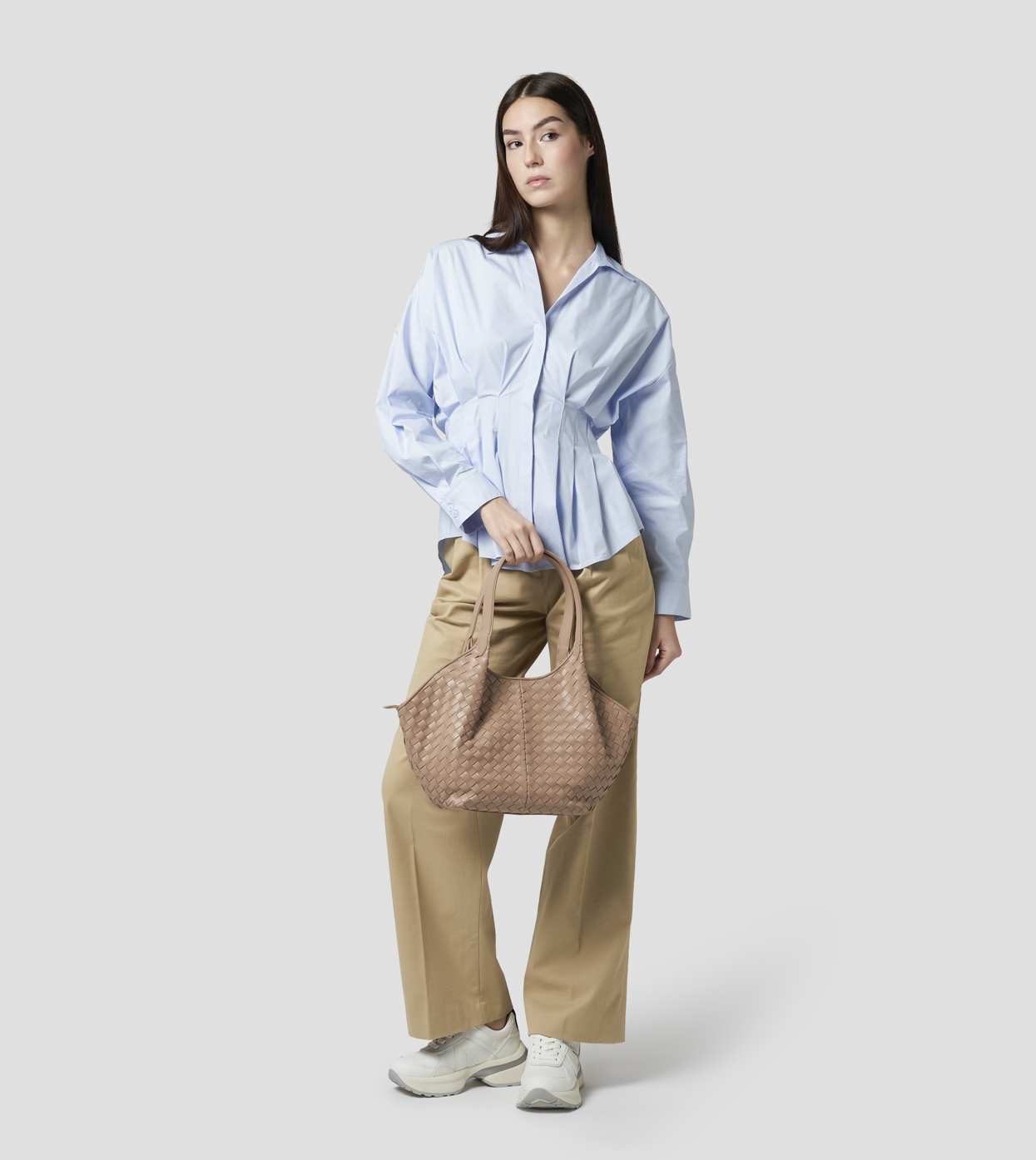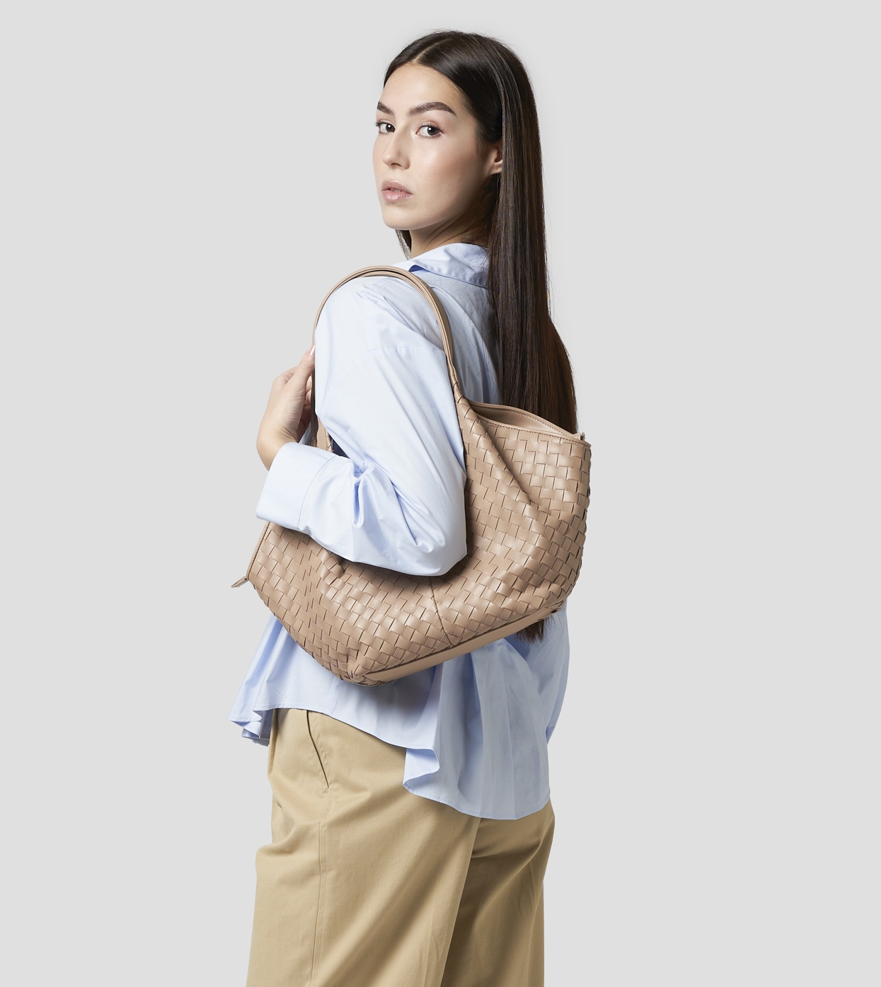 RACHEL is the shopper bag that strikes the perfect balance between comfort and style with its fluid shapes and generous proportions. The minimalist design enhances its wide and welcoming silhouette, ideal for accompanying every moment of the day with relaxed elegance.