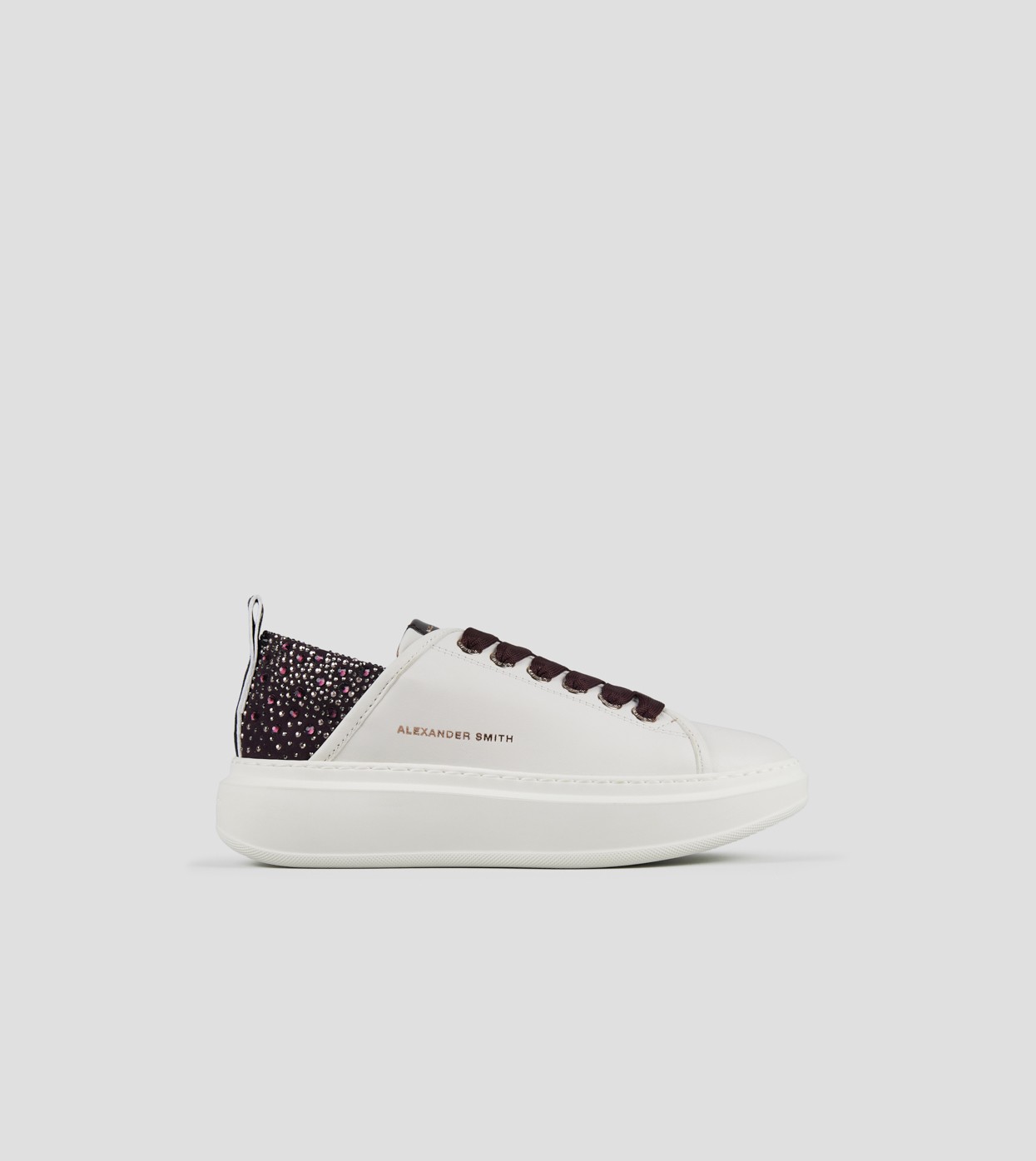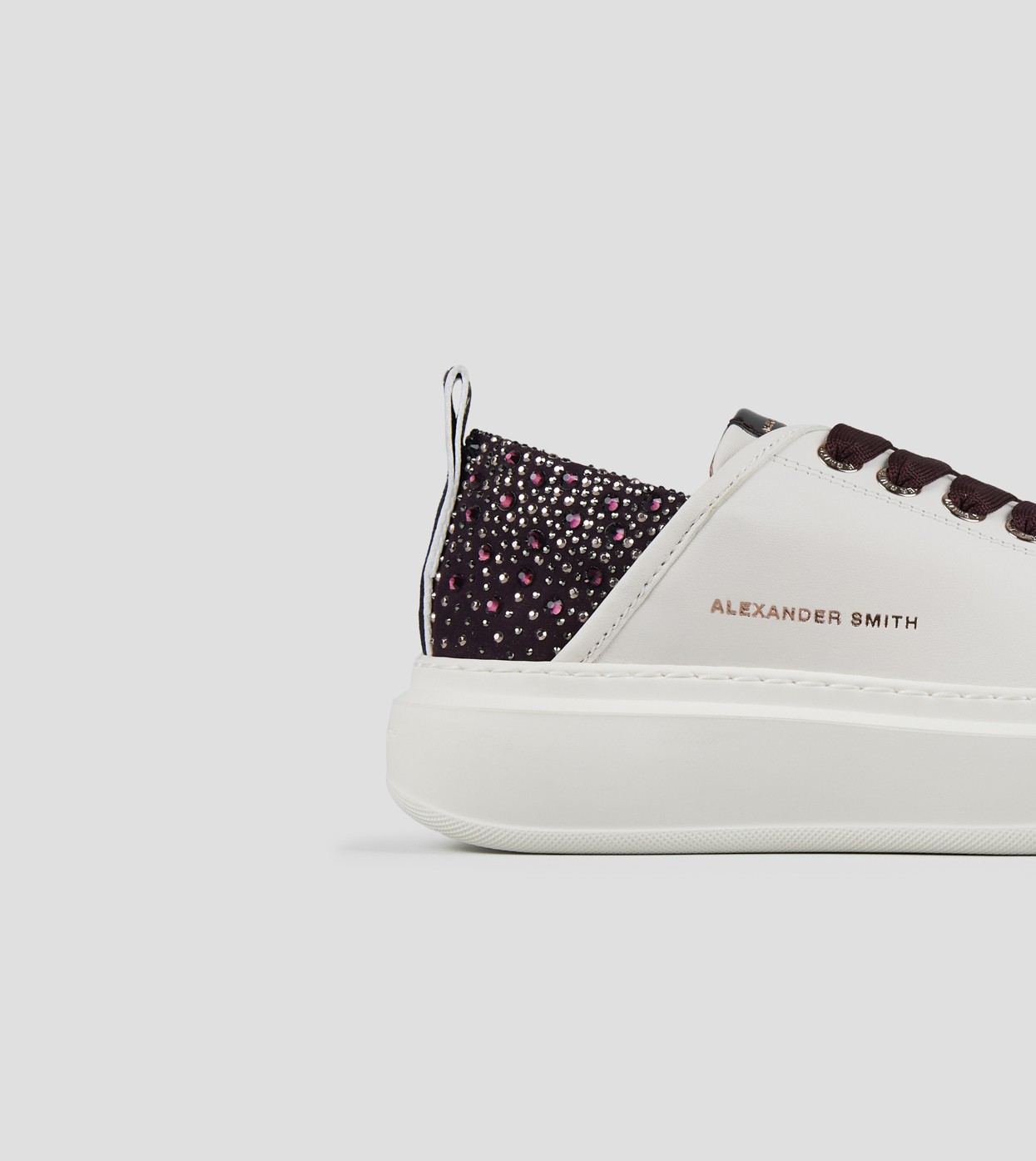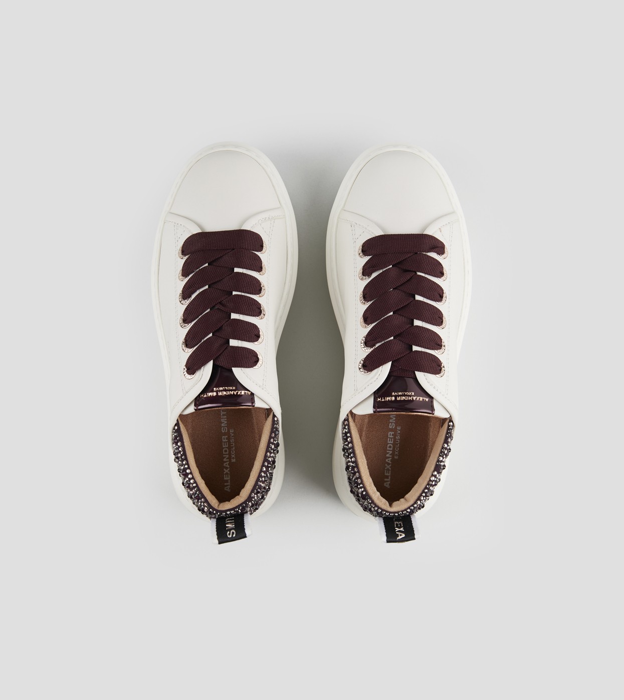 Wembley Woman in white leather and rhinestones bordeaux heel